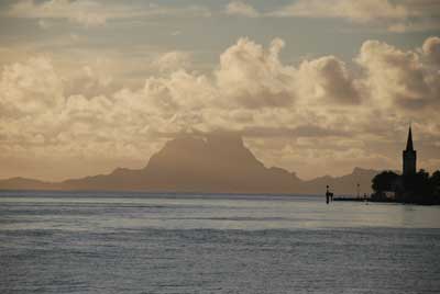 The next day we went to the rest of the island. This is one of the few islands where you can go right around inside the reef. We were anchored where you could see Bora Bora in the distance and Taha’a close by. When we arrived we went to town in the tender to drop off the rubbish and get an ice-cream. On the way back from the shop we saw a shiny dragonfly darting over a stream. Later on we moved anchorages again into the protection of the island because the wind was getting up. From the anchorage we are now in we can see a church with white cement walls and a red tin roof.