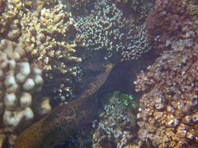 After school the next day we went snorkelling at the beach. It was really good snorkelling, first I saw a school of about 20 small barracuda, then we saw some Moray eels. One was a giant Moray, which can grow up to over 2 meters, and the other one was a wide mouth Moray. Mummy and Daddy also saw a green turtle in the deeper water.
