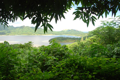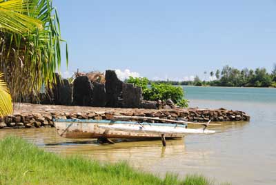 After lunch we had a look at the town and saw a few small shops, a supermarket and a hire car company, so we reserved a car for the following day. There was also a large dock with a couple of large freight containers that the local children were using for diving boards. The next morning we collected the hire car, leaving Mike to look after the boat ( I think he wanted a bit of peace and quiet) and set of on a tour of the island. Our first stop was at an archaeological site next to a big lake. The site had some totem poles and some big slabs of stones that were stuck into the ground and which we later found were used as back rests for chiefs.