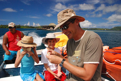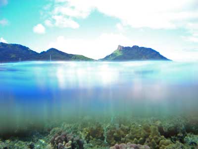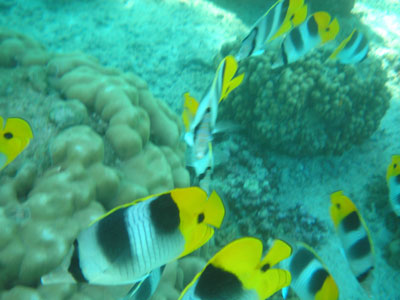 Early the next day Mike, Daddy, Daisy and I all went to have a look at the blue eyed eels again. On the way back from the eels we saw the waterfall again. After we got back to the boat we took the boat around the island, back to Huahine Iti, where we had lunch. We had to be very careful because there were lots of shallow patches in the channel, some of which weren’t on the chart. When we arrived we had a swim, later on we took the tender further round the coast and had a snorkel. While we were snorkelling we saw an octopus. It had hidden itself very well in a crack in the coral. For supper we went and had a nice meal at the restaurant.